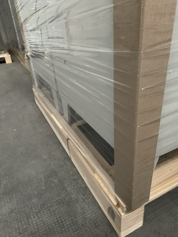 I bancali per gli imballi sono prodotti su misura per accogliere le dimensioni dei vari moduli. Utilizziamo angolari e distanziali in polistirolo espanso ad alta densità ed angolari in cartone per salvaguardare l’integrità del prodotto. In seguito, vengono fissati al bancale con reggia in plastica ed avvolti con politene estensibile